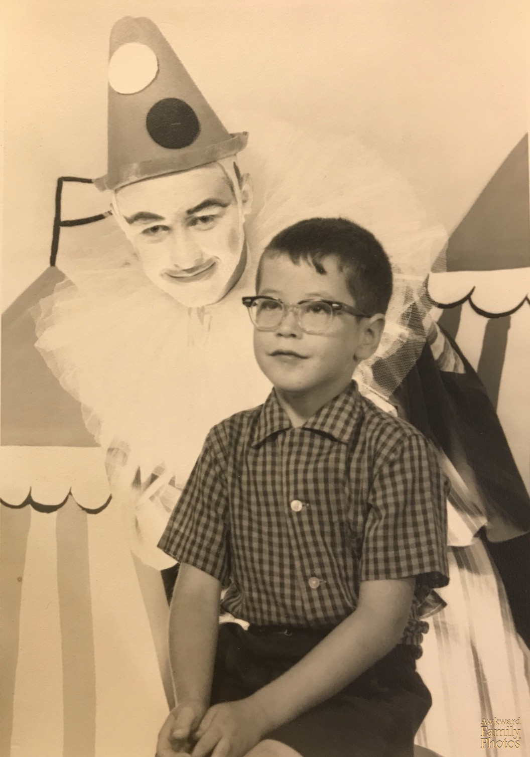 “My parents were students when I was growing in Northern California up and there wasn’t much money. We did have a hound dog and my father decided that I should go dressed as a “dog food bag” for Halloween when I was 8 years old. Standing in front of the very 70’s fridge (Harvest Gold) post trick-or-treating – hence the smudgey make-up. Little floppy felt ears were sewn onto a stocking cap and I was wearing brown tights – I wasn’t thrilled but all the suburban mothers that night thought it was “the cutest little thing!”.”