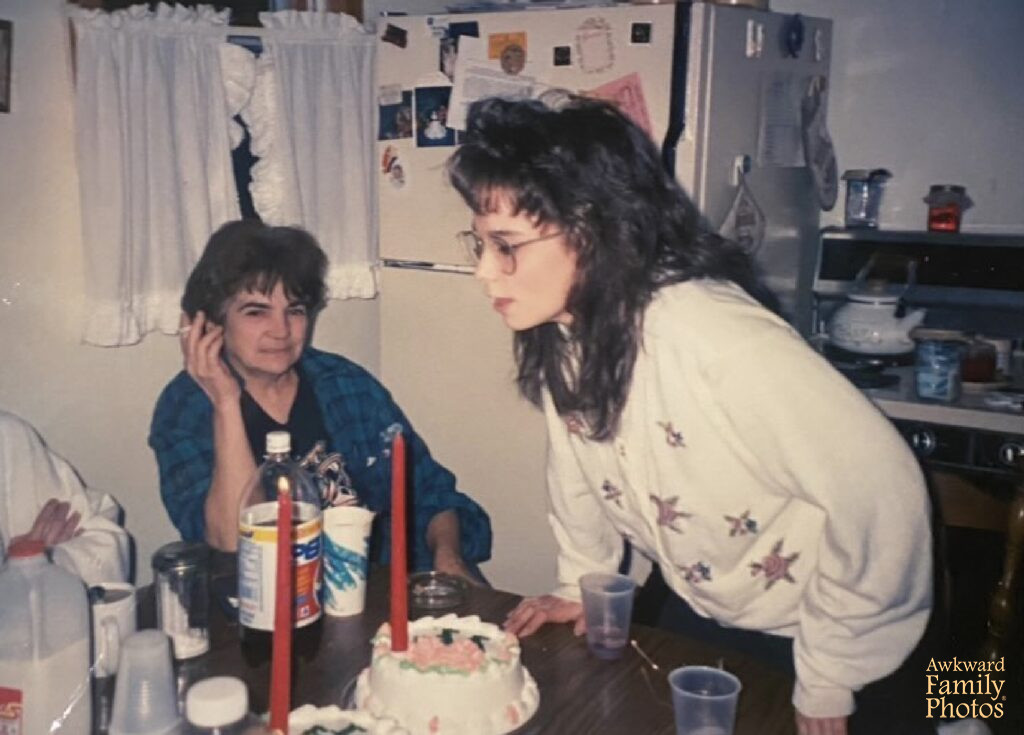 “This was taken for my mom’s December birthday — notice the weird birthday cake with Christmas trees on it. She looks thrilled. One hand with a death grip on my brother (who thought he was the ultimate warrior from WWE) and the other with a cigarette to take the edge off.”