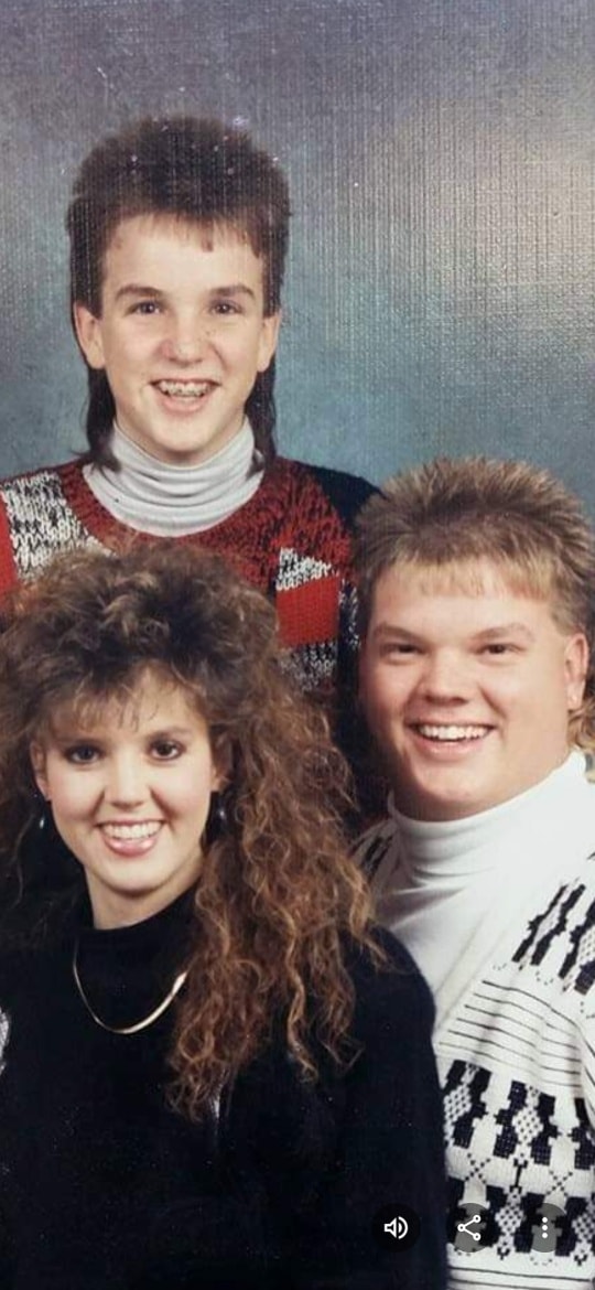 “1990, Missouri. My sister brought us to a “photo studio” someone had set up in a hotel room of the Red Lion Inn. I guess we needed a pic to memorialize our epic 90s hair.”