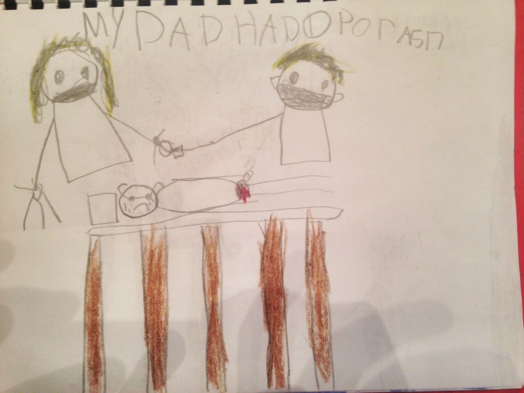 “Drew this for kindergarten. It’s about my Dad’s vasectomy. The title was ‘My Dad Had An Operation.'”