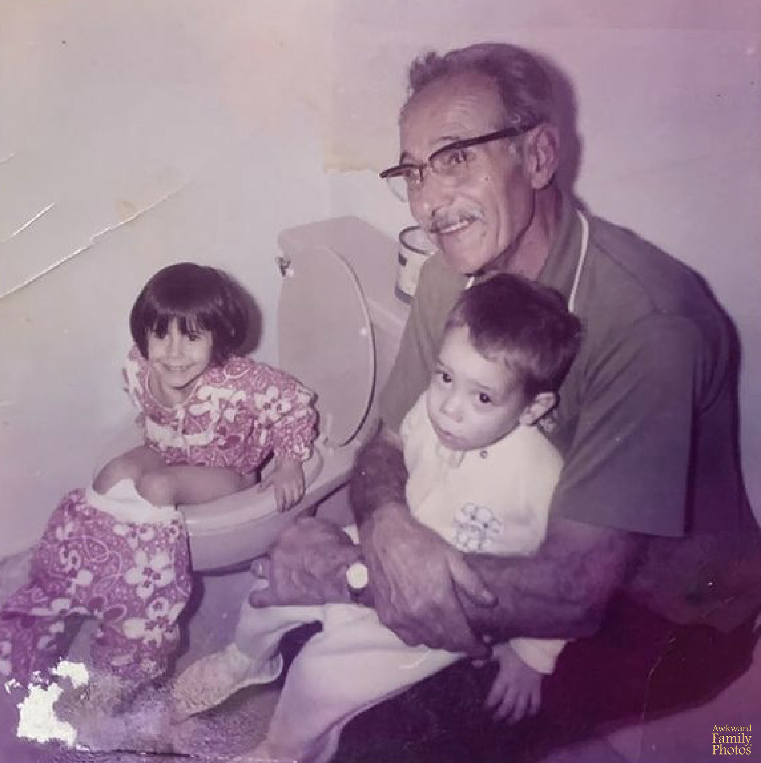 “Can’t explain anything about this picture of my grandfather with my little brothers as I was away at college. Apparently everything went straight to hell once I left home–maybe wearing clothes became optional. My mother must have taken this…I have no idea what she was thinking.”