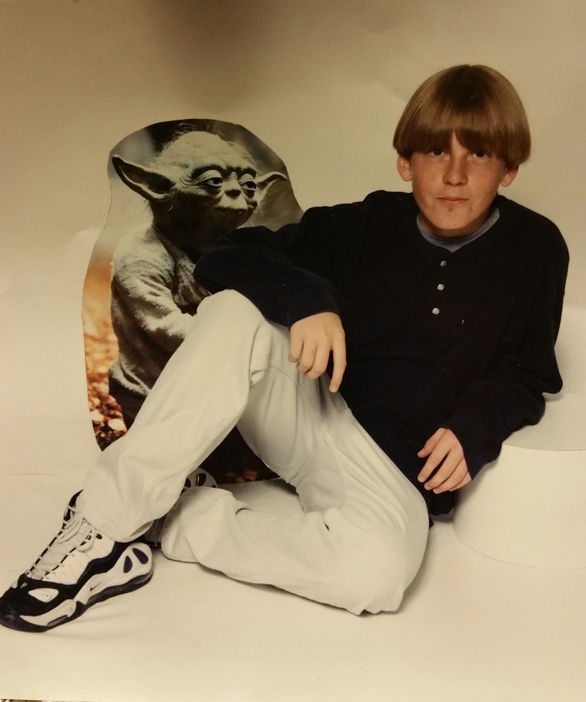 “Back in 1997, my 8th grade school photo. I made the prop myself. No regrets.”