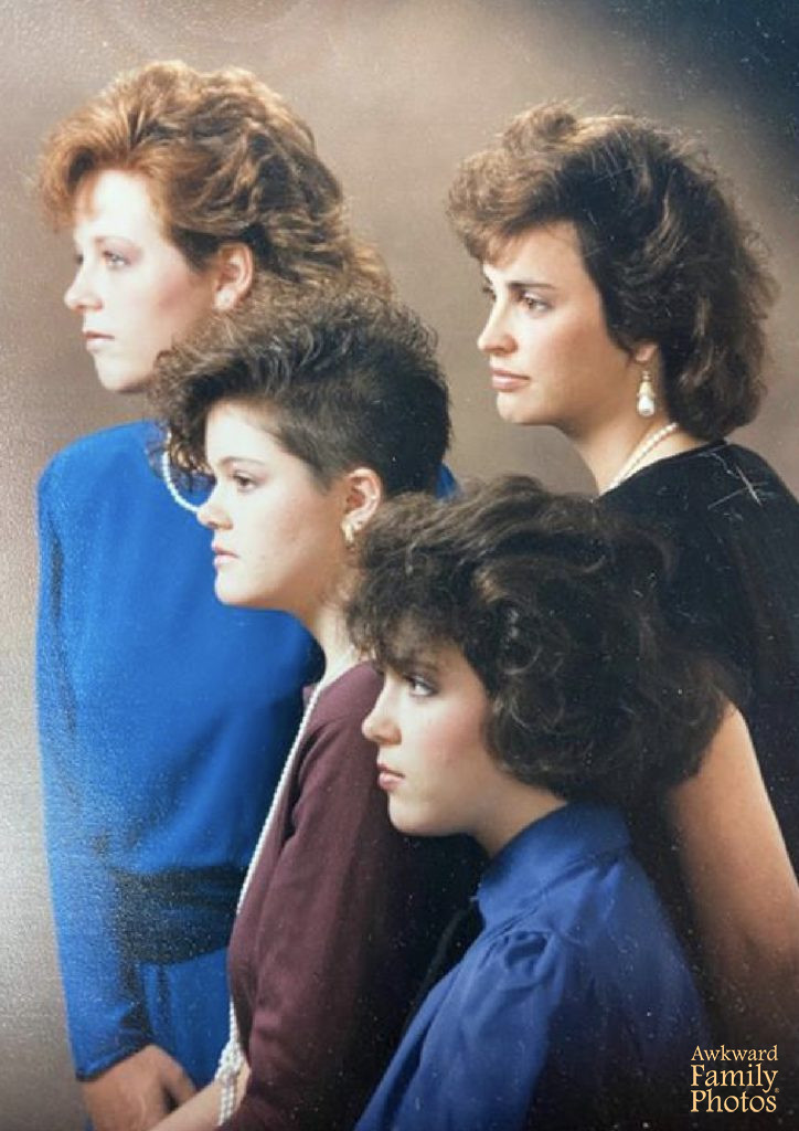 “My sisters and I, Casper Wyoming circa 1985. Hair, pearls, blank stares.”