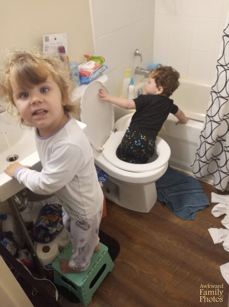 “I was busy vacuuming up some spilled cereal when I walked into this bathroom party.”