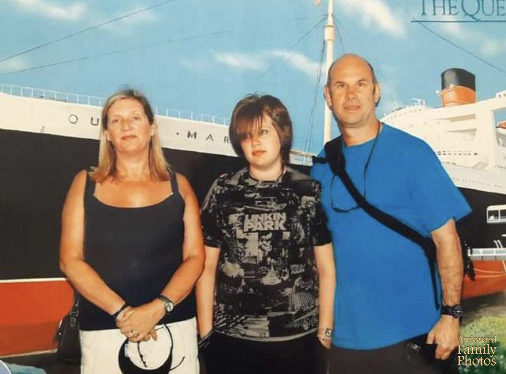 “This family picture was taken around 1989, not 1969 as the hairstyles and tacky wallpaper might lead you to believe. Though this is my immediate family (I’m the girl with her eyes closed), fortunately this is not our house. Between my mom’s perm, my dad’s dejected slouch, my sister’s broken wrist and mid-chew expression, and the world’s most hideous interior design, this picture is bursting with awkwardness!”