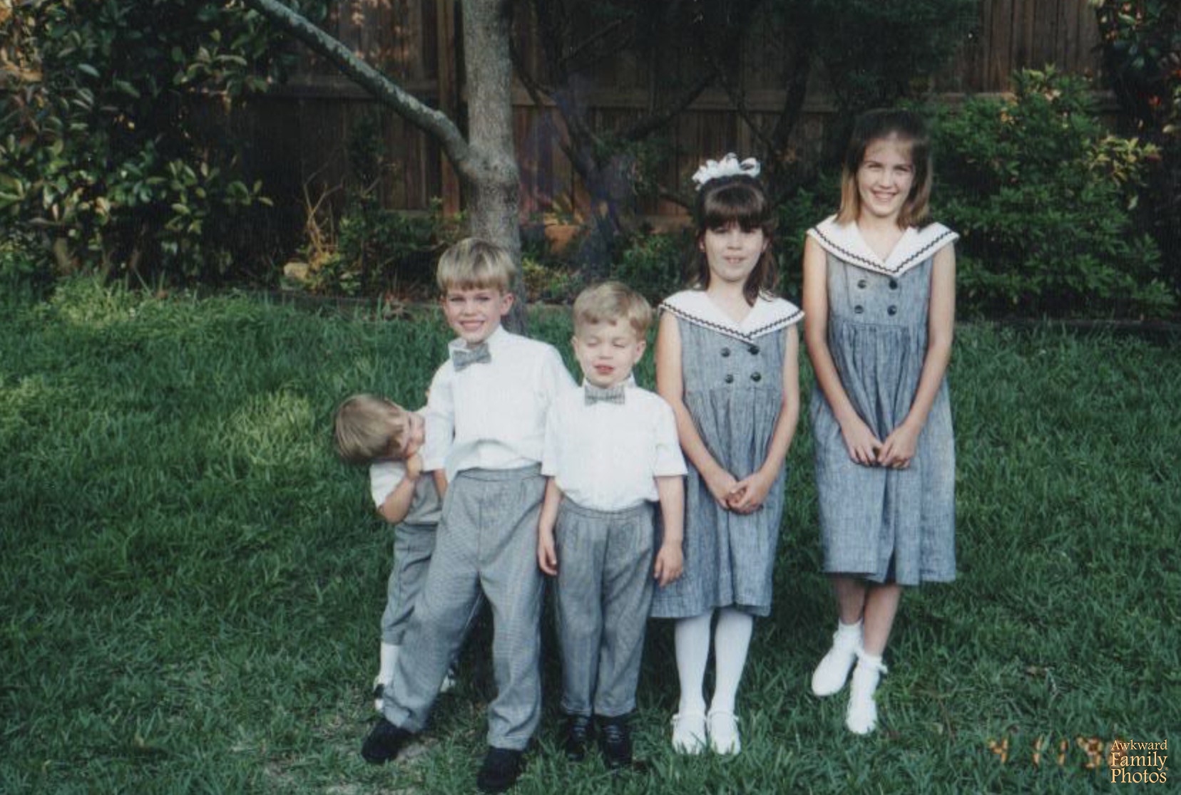 “Here is me, about 8 or 9 years old, in a photo booth with my baby brother. The camera timer was almost up, and as I was too little to hold him up, I had to grab him by the throat to make sure he was looking at the camera.”