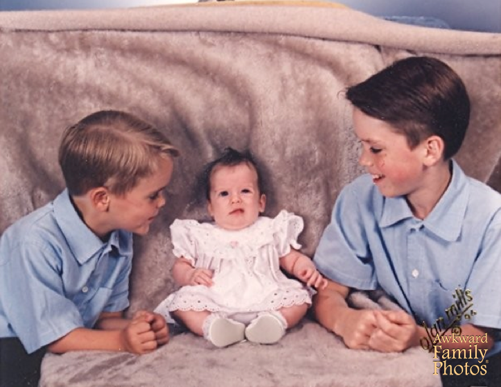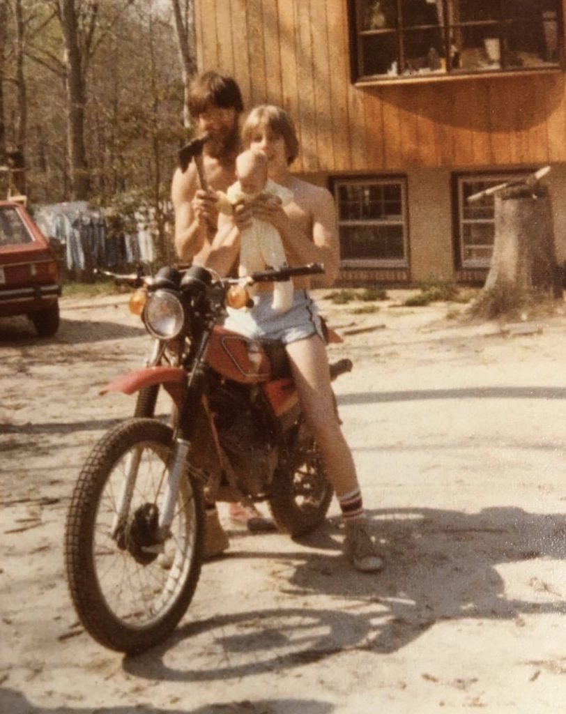 “Teenage bro holding infant bro on dirt bike while dad adds a hatchet for safety, 1980.”