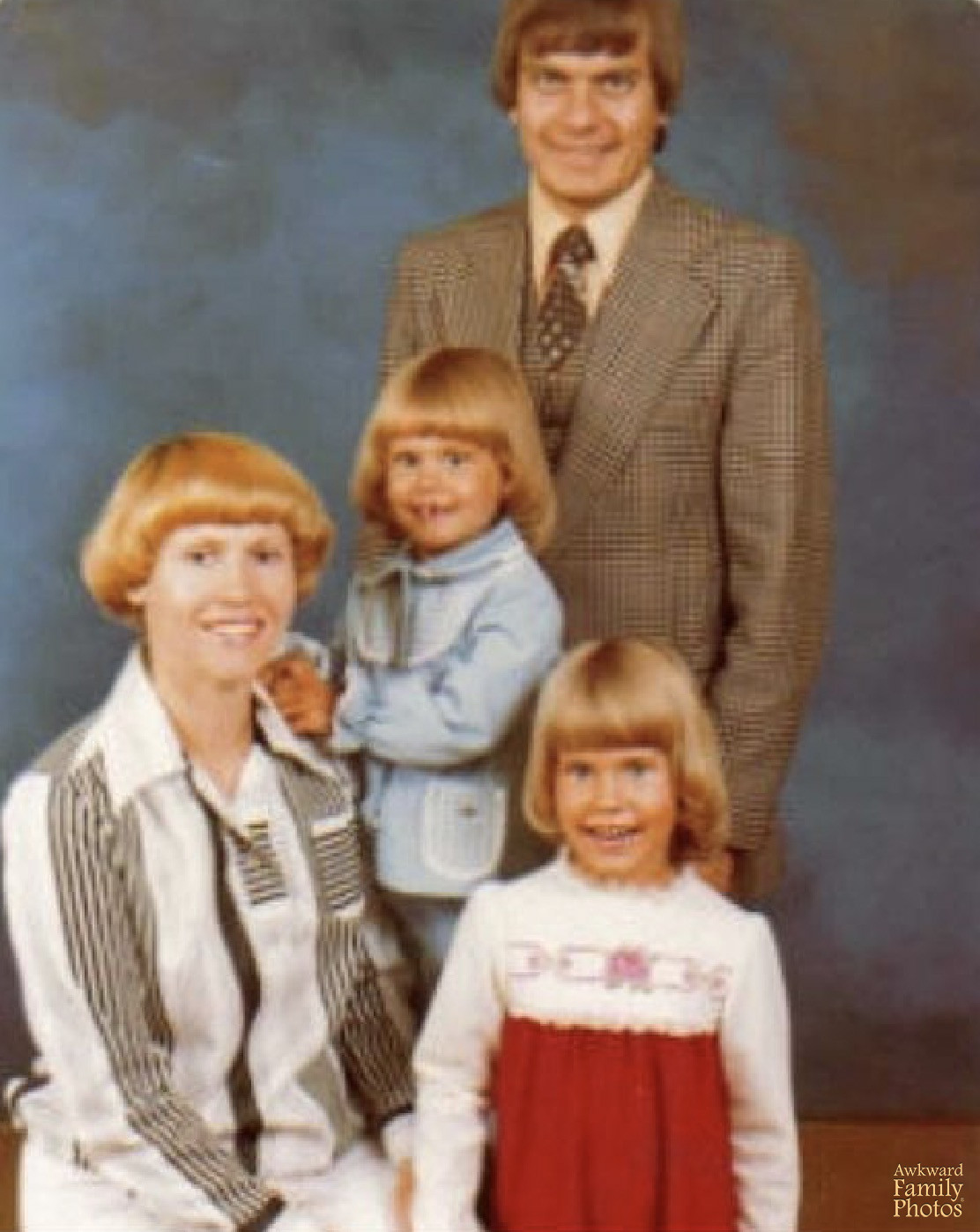 “Every year my mother wanted a nice family photo and this time around she chose our outfits. Matching jean dresses for my sister and I, jean dress for her (with that awesome big hair that she permed) and a jean shirt for my dad. (Plus I don’t know where we are all looking…but it wasn’t at the camera.) This is in honor of my mother who passed in 2015 from Melanoma.”