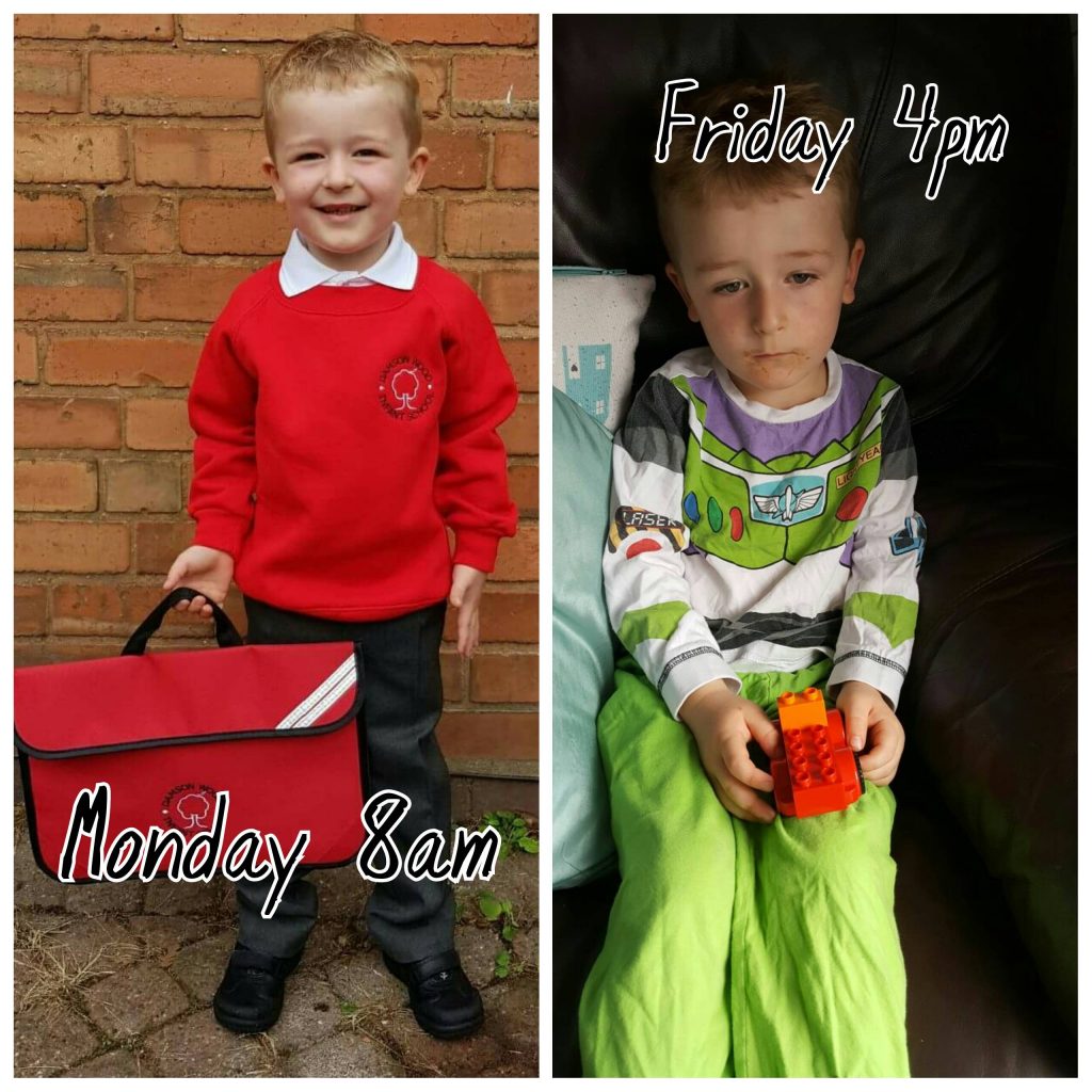 “My son on Monday and Friday of his first week of school. Welcome to the real world, kiddo!”