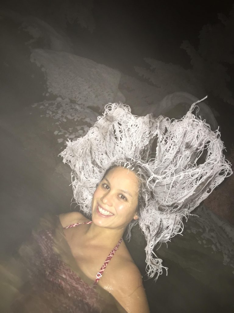 “My wife’s hair after 15 minutes in -20º F (-29º C) while basking in some hot springs.”