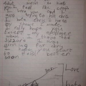 “My niece drew this at school. It looks like she and I are being hanged while her mum is watching. Her teacher called her mother in for a meeting; her mother had to explain we went to a high rope obstacle course on the weekend and the ropes were attached to harnesses. Never judge a book by its cover.”