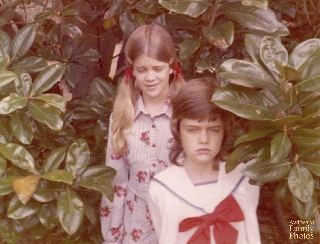 “The fact that my sister is superimposed as a giant ghostly head distracts from the more disturbing details– like the fact that I am sitting on my older brother’s lap and holding hands with him, and that we also have matching glasses. I don’t remember a lot about the day that we took this photo, but I do remember thinking that my brown striped sweater was my ‘cool’ sweater and I insisted on wearing it. The fact that my collar had a longer wingspan than a bald eagle is a nice finishing touch.”