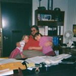 “Boston in the early 80s. My cousin is in the Mr. Nonsense shirt, and living up to that name. My aunt has a very original ‘necklace.’ My brother was apparently trapped inside and trying to get in on the photo action. And Mom was having none of it.”