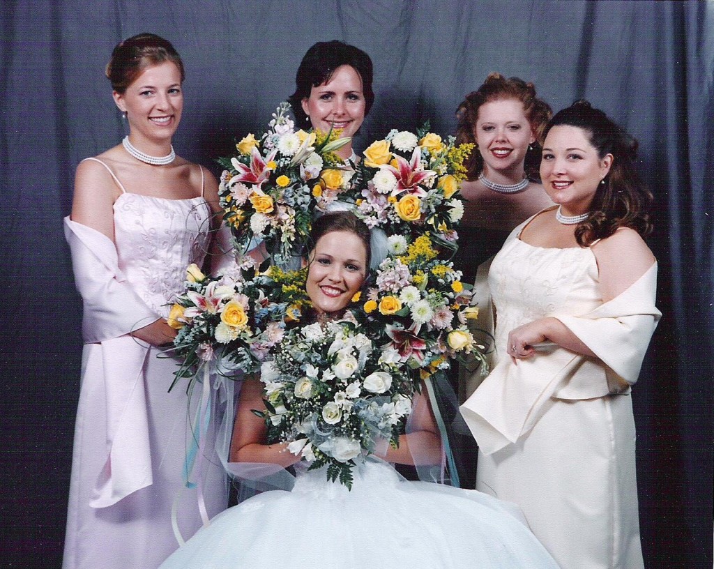“Here’s my wife tossing the bouquet… two of my sisters, a friend, and only a distant cousin reaching for it. Believe it or not, the flowers were caught but my sister in the center– off-hand snag. Funny thing is that everybody in the picture got hitched within five years… that is, except for the young lady reaching for the flowers.”
