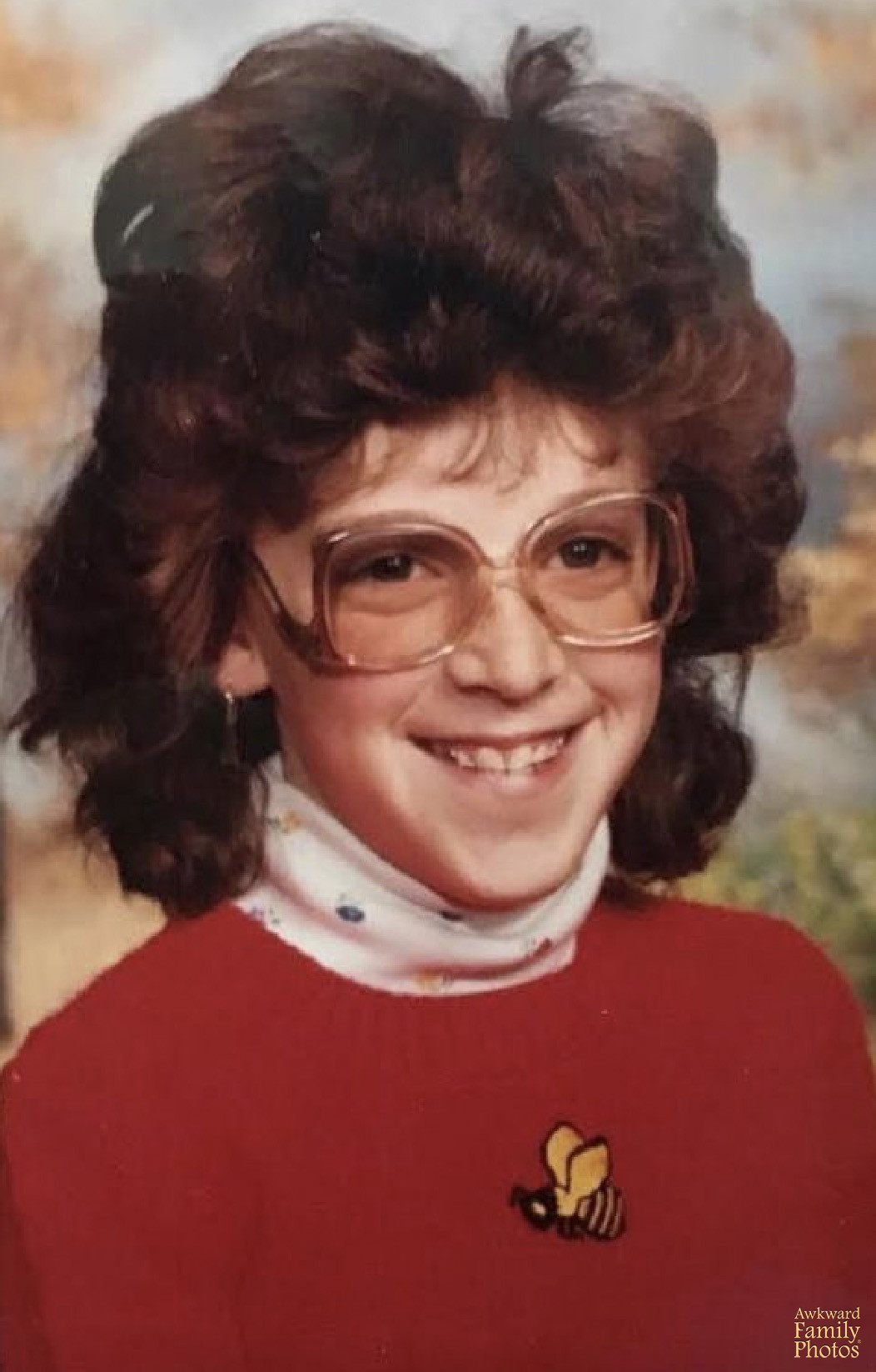 “This is a school photo of my older sister from 1988. The monstrosity upon her head is reflected in her expression. The lasers in the background and applique-roses sweatshirt only add to the epic-ness.