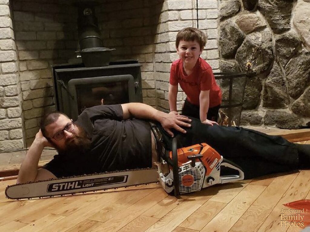 “My brother with his true loves: my nephew and his giant new chainsaw.”