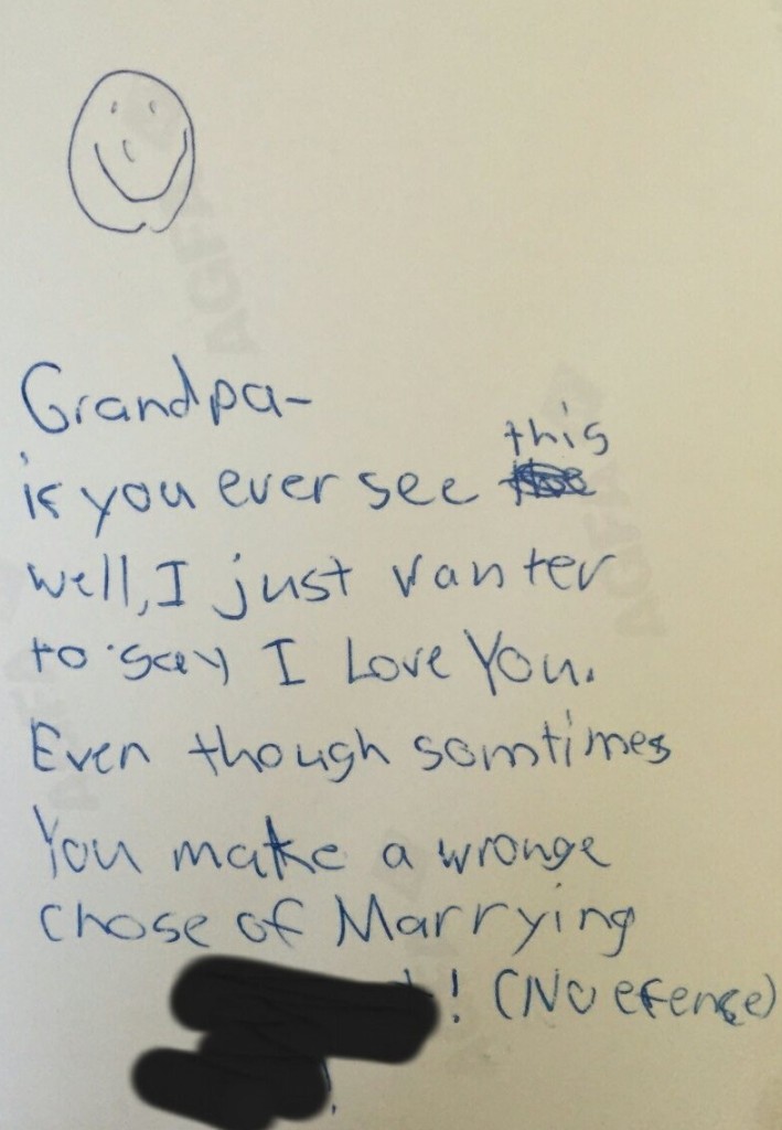 “A note I wrote as a child in response to my grandpa getting remarried.”