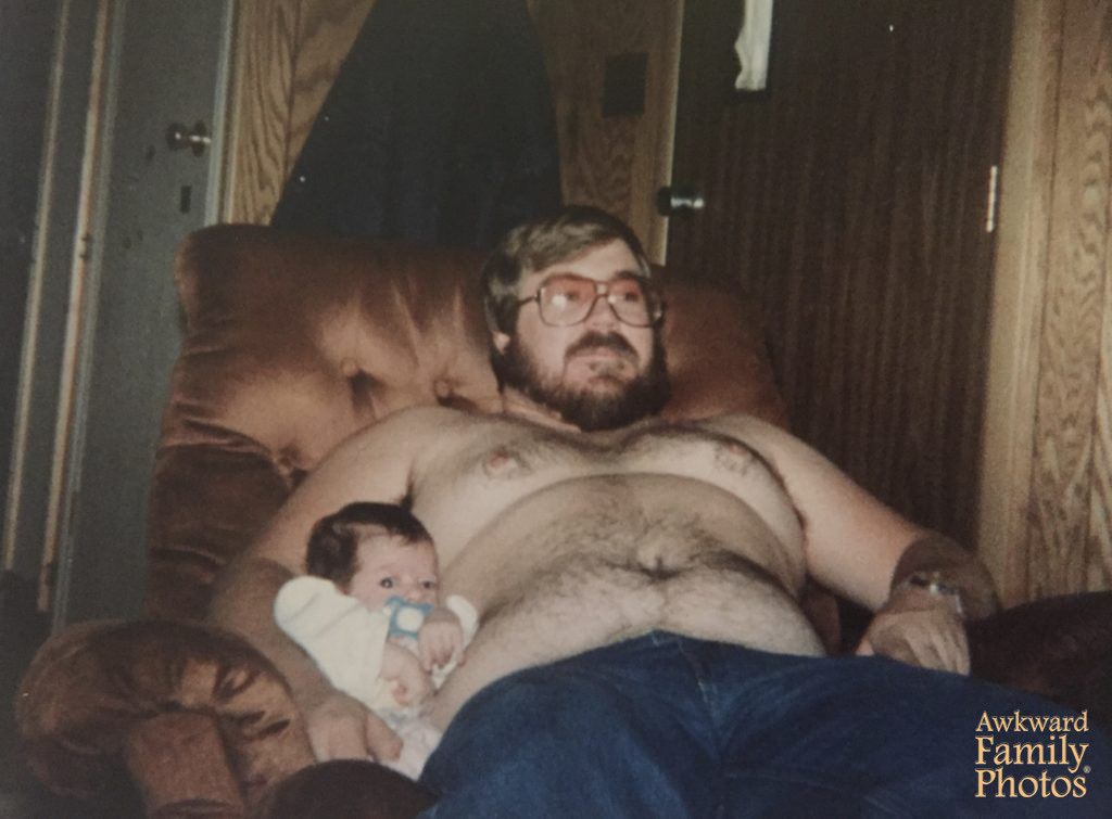 “My uncle, gently holding me as an infant. Tiny me doesn’t look very comforted.”