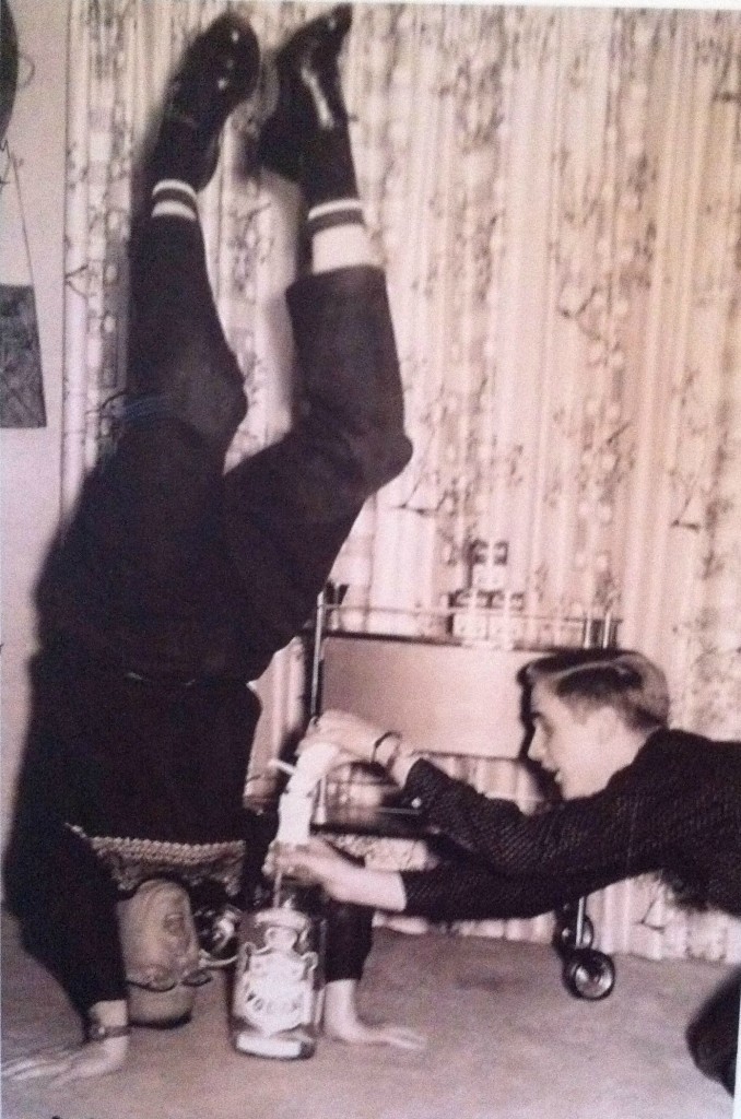 “My great-grandfather in his younger years doing a headstand… while being funneled Smirnoff.”