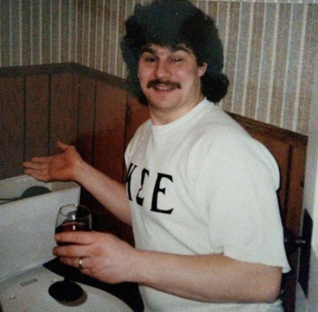 “My dad, drinking wine and fixing the toilet, circa 1990.”